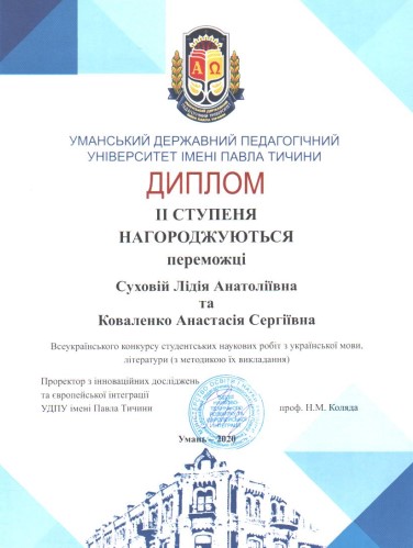 У 2020 р. здобувачів освіти IV курсу А. Коваленко та Л. Суховій було нагороджено дипломом ІІ ступеня за перемогу на Всеукраїнському конкурсі студентських наукових робіт з української мови, літератури (з методикою їх викладання)
